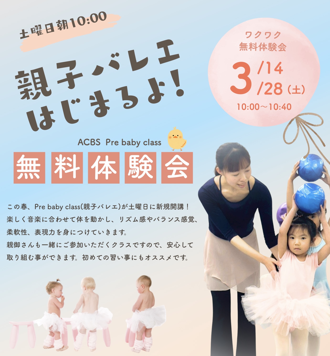 幼児心理アドバイザー/日本バレエ協会バレエリトミックティーチャー資格を持つまゆ先生が、お子様の気持ちに寄り添ったアプローチで優しく楽しく指導くださいます。この機会に是非ぜひ、ご参加ください。